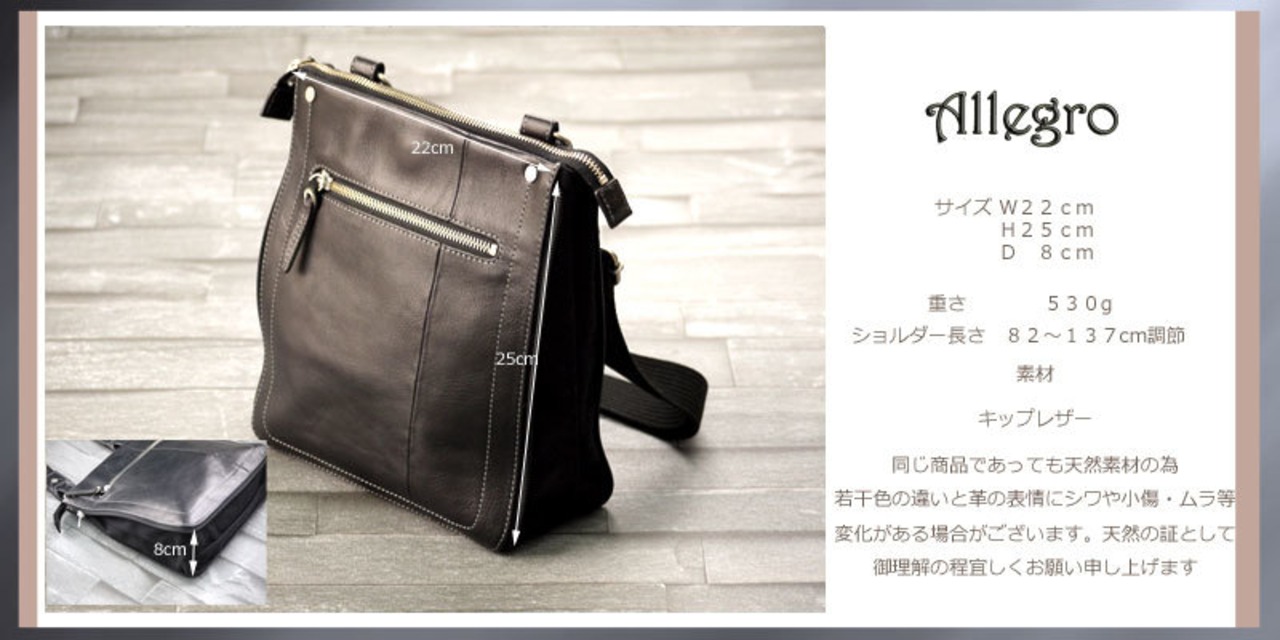ポイント! 本格派商品を価格を抑えて提案する新ブランドからキップレザーを使用した拡張型ショルダーバッグのご紹介♪なんといってもこれだけキップレザーを贅沢に使用し、この価格での御提供は本当にお勧めできる値打ちあるアイテムです!ファスナー引き手にもワンデザインを施し、金具もオリジナルと細部までこだわっています!機能的にも小さめですが普段持ちにはちょうど良く、拡張仕様に仕上げていますので幅広い年齢層にも対応できる使えるデザイン、使用感を実現しております。どこに持ってもおかしくない!どこへでも持って行っていただきたい自信を持ってお勧めできるアイテムです!少量生産知る人ぞ知る本物志向のアレグロをぜひご検討ください!!